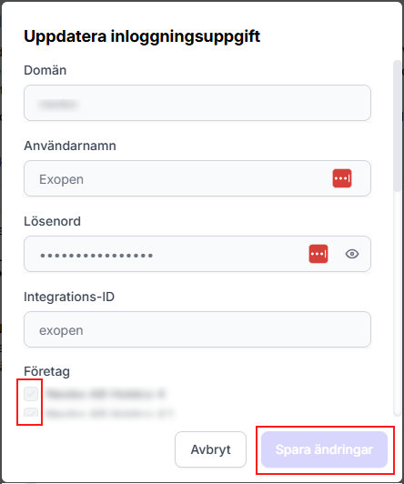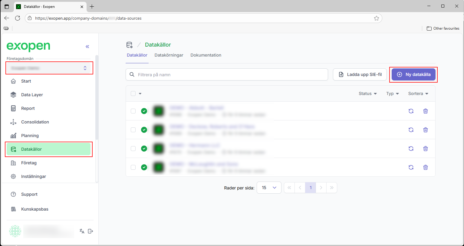 Börja med att logga in i portalen (https://exopen.app/), välj korrekt bolag under "Företagsdomän".