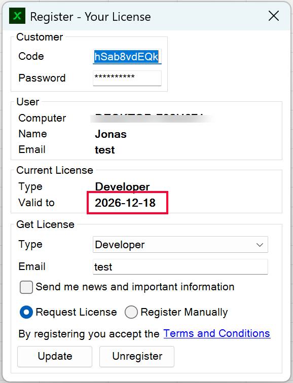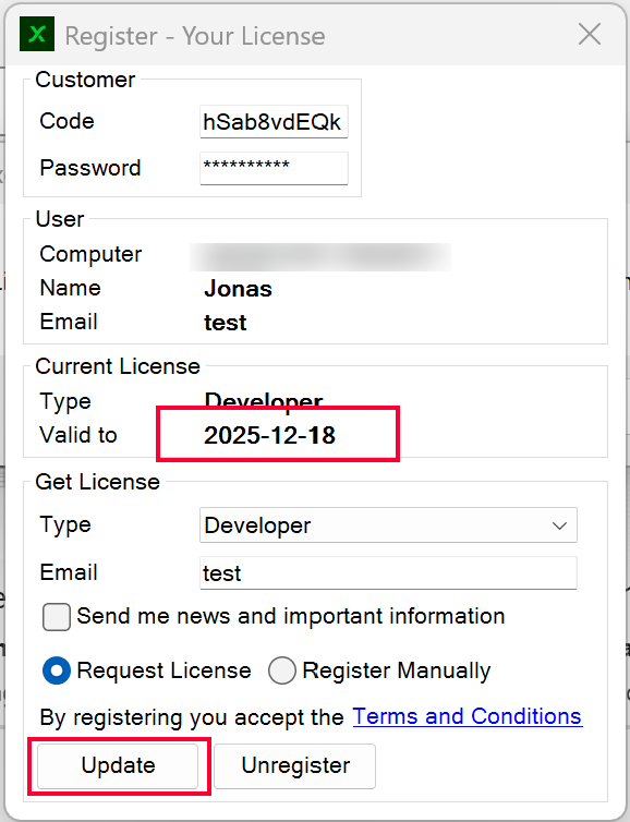 I registreringsdialogen kan du notera datumet för när licensen kommer gå ut, för att uppdatera licensen trycker du sedan bara på "update"